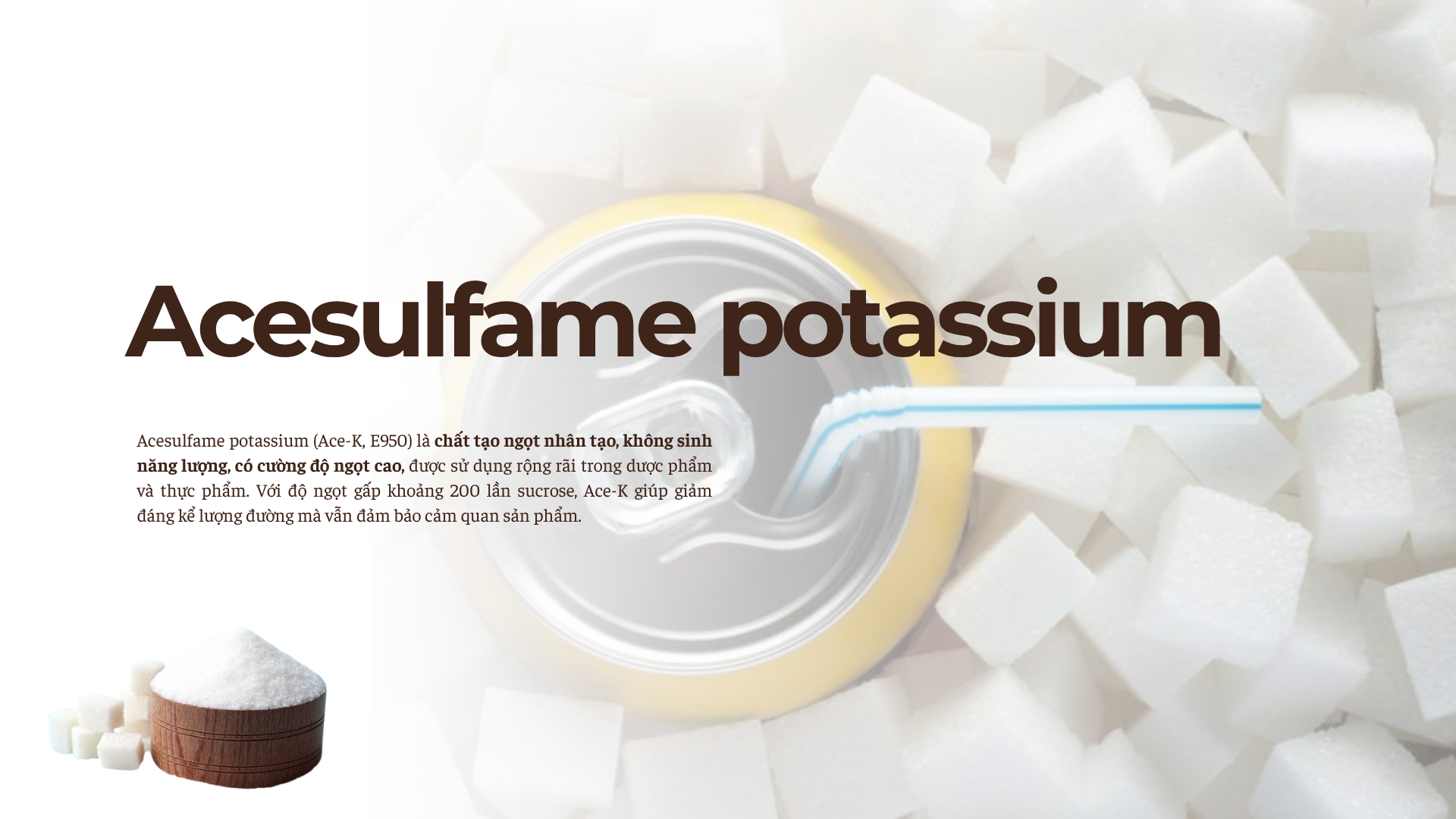 Acesulfame potassium (Ace-K, E950) là chất tạo ngọt nhân tạo, không sinh năng lượng, có cường độ ngọt cao, được sử dụng rộng rãi trong dược phẩm và thực phẩm. Với độ ngọt gấp khoảng 200 lần sucrose, Ace-K giúp giảm đáng kể lượng đường mà vẫn đảm bảo cảm quan sản phẩm.