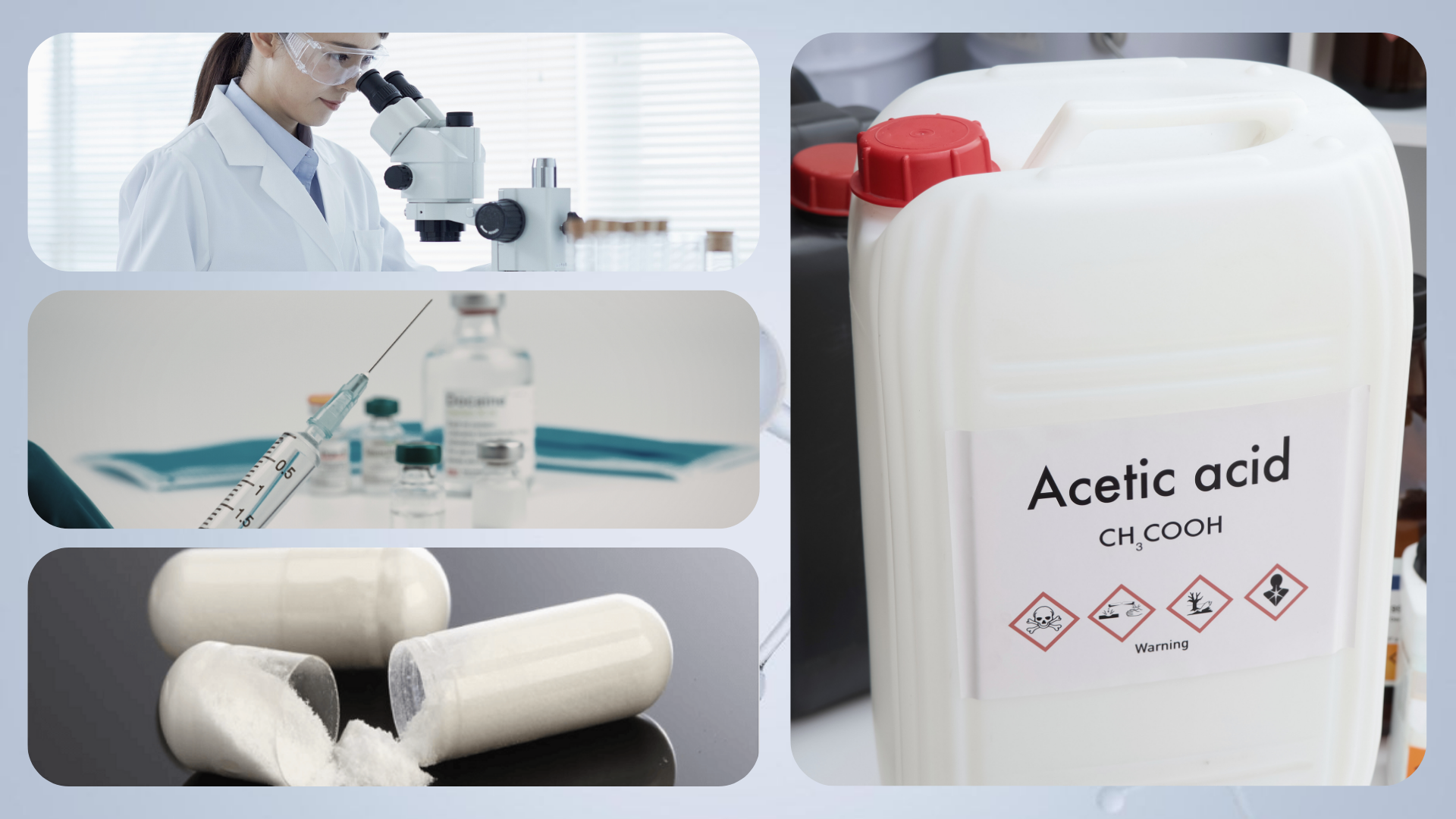 Sản xuất dung dịch tiêm và thuốc tiêm truyền: Acetic acid được sử dụng để điều chỉnh pH và tạo hệ đệm trong các công thức thuốc tiêm.