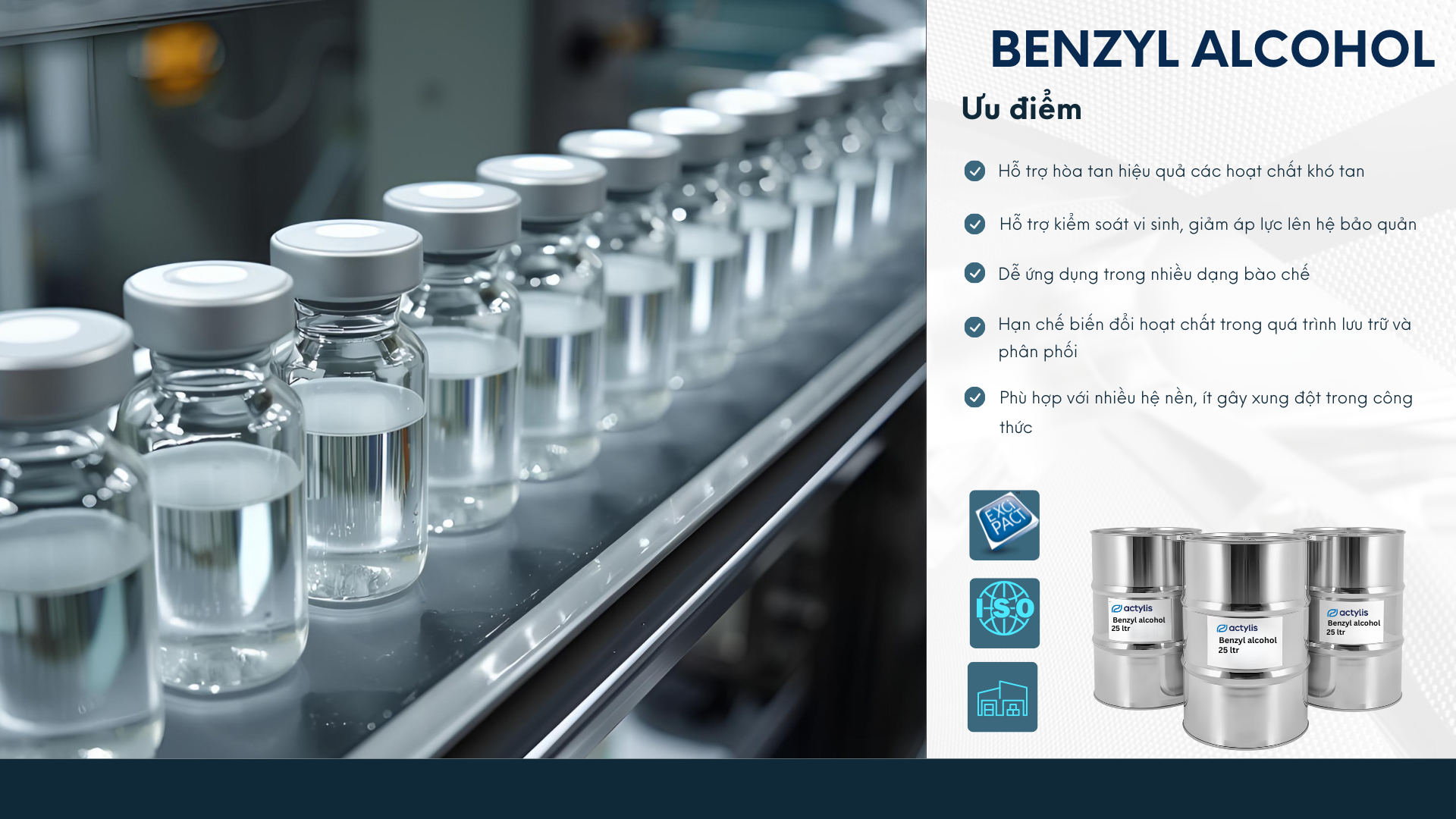 Trong các công thức hiện đại, đặc biệt là thuốc tiêm đa liều, dung dịch vô khuẩn, sản phẩm chăm sóc da cao cấp, Benzyl Alcohol không chỉ đảm bảo khả năng hòa tan hoạt chất khó tan mà còn đóng vai trò kiểm soát vi sinh hiệu quả, giúp tối ưu tuổi thọ và độ an toàn của sản phẩm.