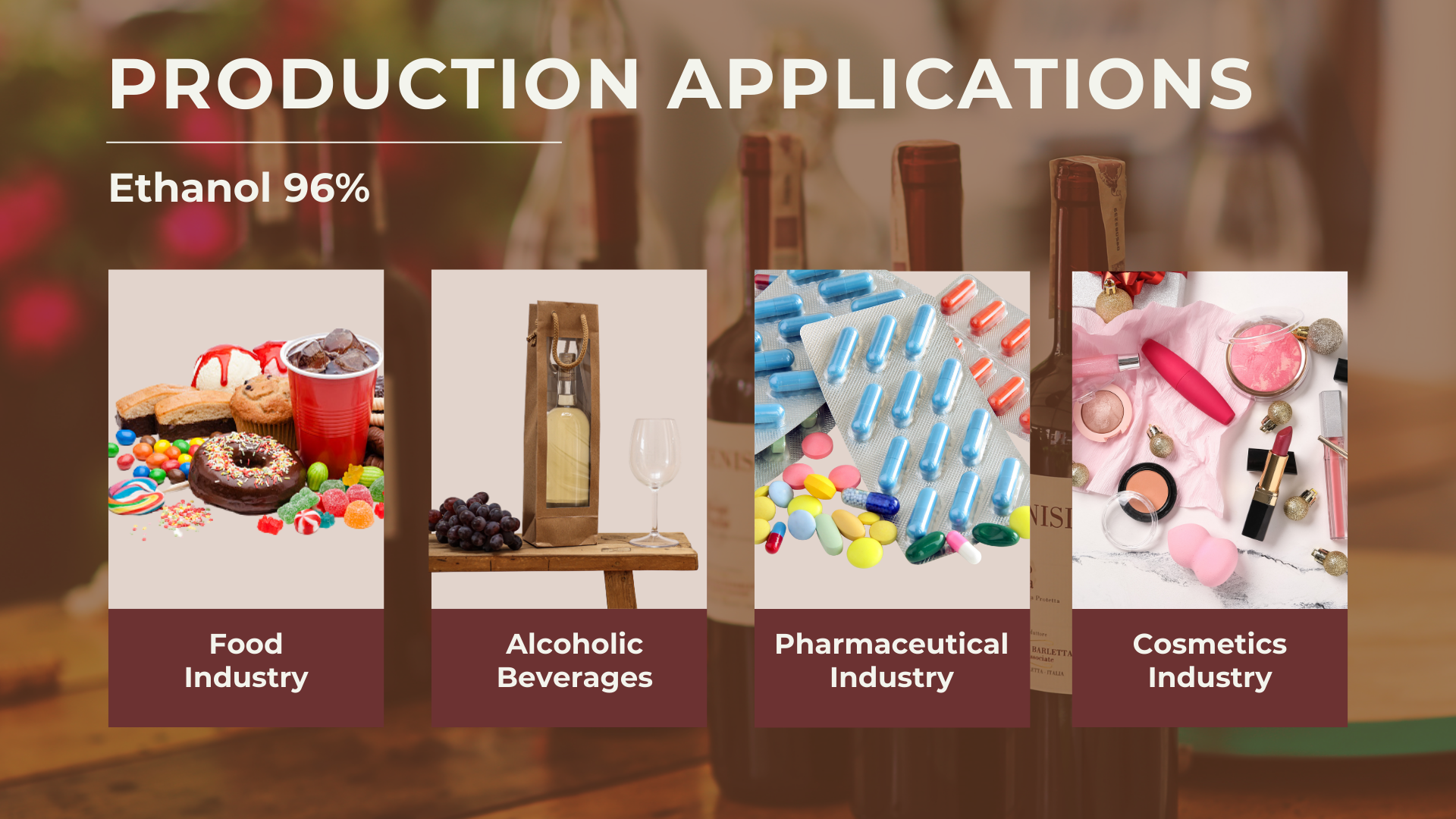 Nhờ những đặc tính này, ethanol 96% trở thành nguyên liệu không thể thiếu trong sản xuất rượu cao cấp, đặc biệt là các dòng rượu được ủ lâu năm như rượu 12 năm tuổi.