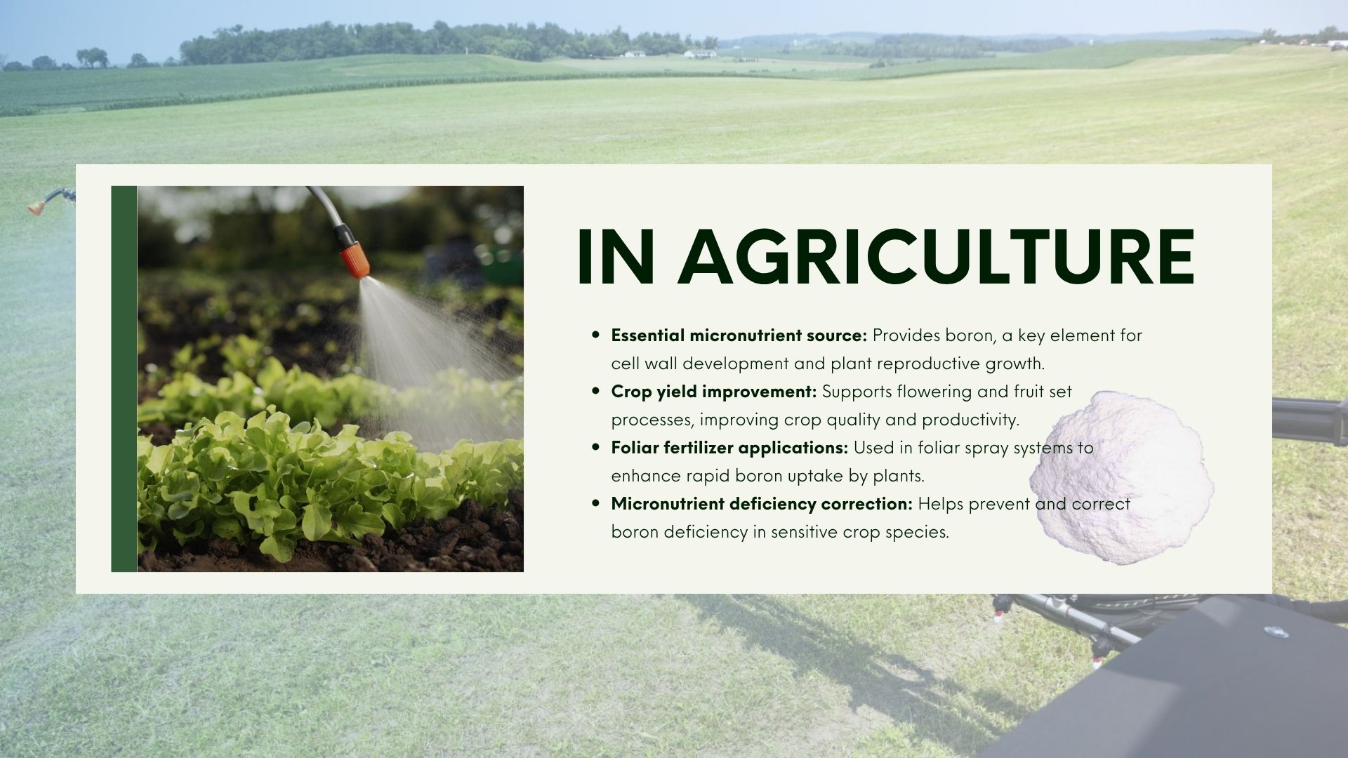 Ứng dụng phân bón lá:Sử dụng trong hệ thống phun qua lá giúp cây hấp thụ boron nhanh chóng.