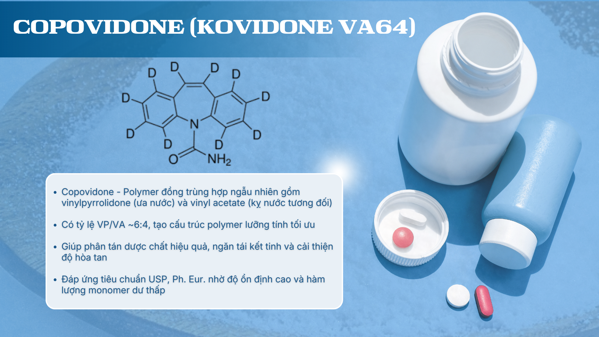 KoVidone VA64 là tên thương mại của copovidone chất lượng cao, được tối ưu hóa để đáp ứng các tiêu chuẩn nghiêm ngặt của ngành dược và đảm bảo tính ổn định trong các công thức tiên tiến.